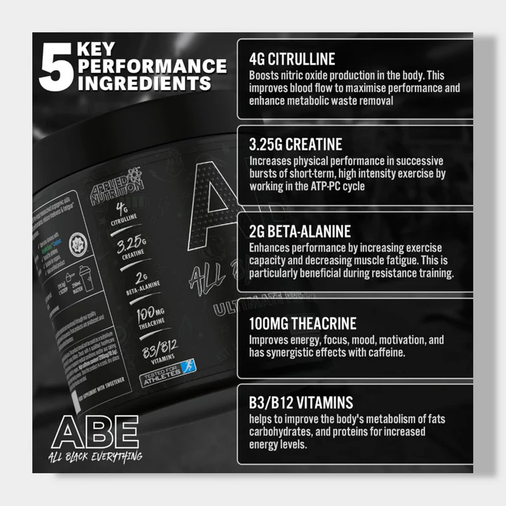 ABE Pre-Workout utilizes Zynamite, Vitacholine, and Huperzine A to give unmatched mind-muscle connection and focus.