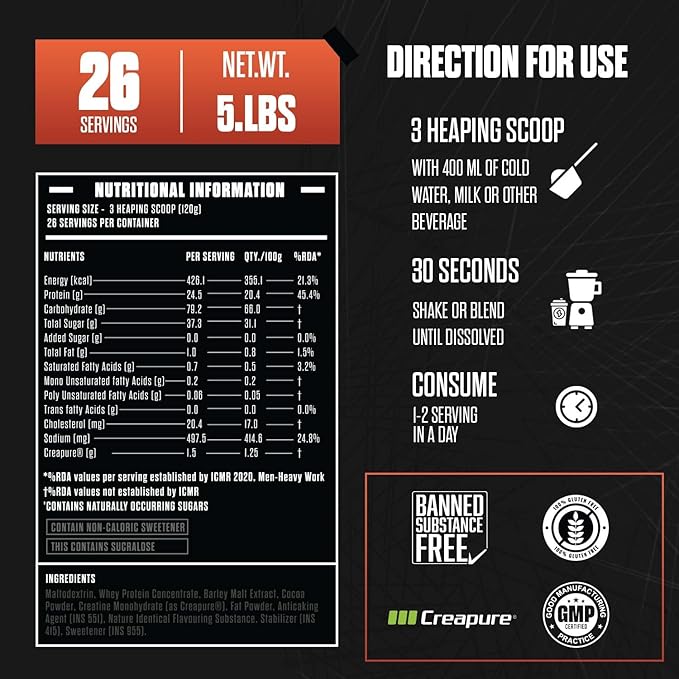 Maltodextrin. Whey Protein Concentrate, Barley Malt Extract, Cocoa Powder. Creatine Monohydrate (as Creapureยฎ), Fat Powder. Anticaking Agent (INS 551). Nature Identical Flavouring Substance, Stabilizer CINS 415). Sweetener (INS 956)