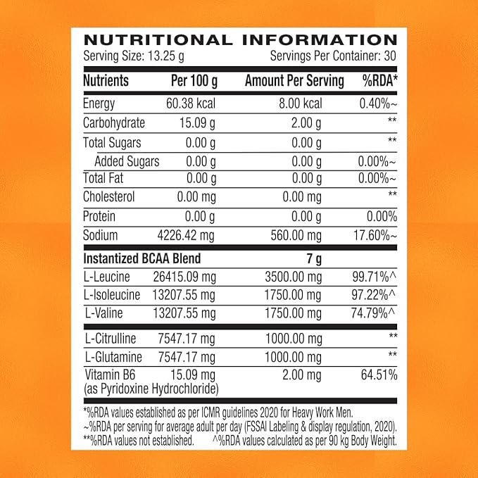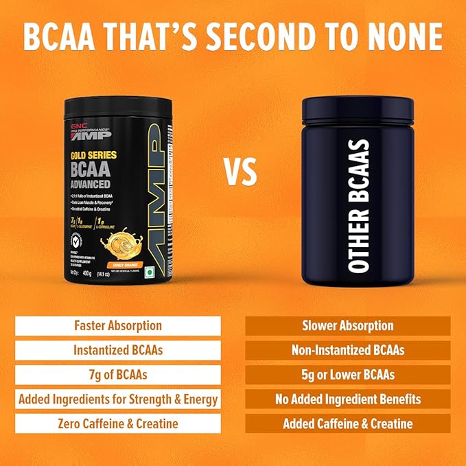 Trigger your beast mode ON with GNC AMP Gold Series BCAA Advanced supplement. It features 2:1:1 ratio of instantized BCAAs, including 3.5gms Leucine, 1.75gms Isoleucine, and 1.75gms Valine, which effectively helps build lean muscles and boost immunity. This BCAA powder contains 1gm of L-Glutamine to alleviate muscle fatigue and promote faster post-workout recovery. Plus, it has 1gm of L-Citrulline that improves blood flow in muscles, getting you ready for a heavy fitness session. GNC’s BCAA supplement for men includes Vitamin B6 to make up for its loss during intense workouts. GNC’s BCAA supplement has zero Caffeine and Creatine, preventing dehydration or digestion discomfort. It comes in a delicious quirky flavor that makes each sip super enjoyable. Plus, the formula contains zero added sugar for keeping up with your health goals. GNC’s BCAA powder is World Anti-Doping Agency (WADA) approved and Informed Choice certified.