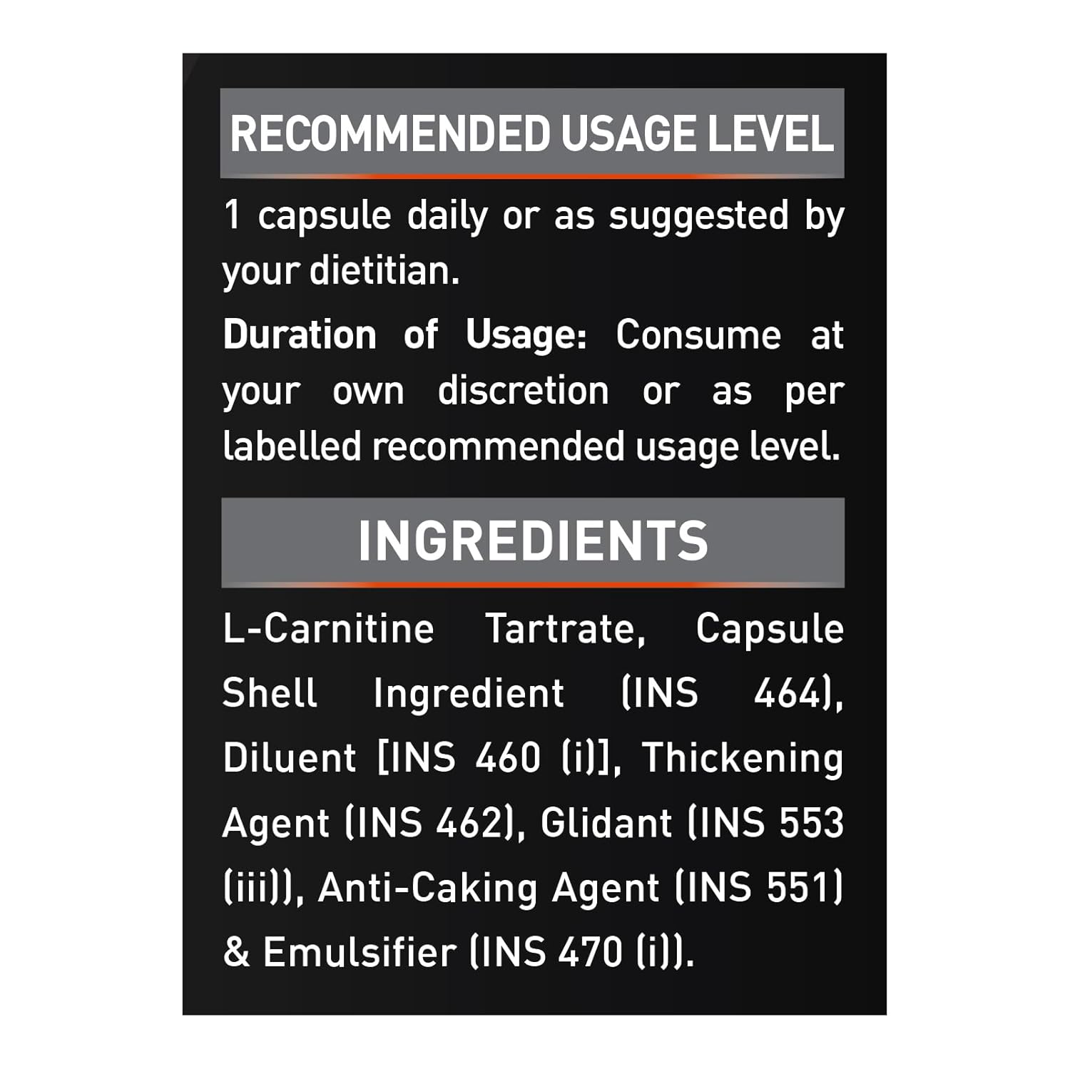 L-Carnitine, L-Tartrate, Capsule Shell (INS 464), Diluent (460(i)), Coating Agent (INS 462), Glidant (INS 553(iii)), Anticaking Agent (INS 551), Emulsifier (INS 470(i))