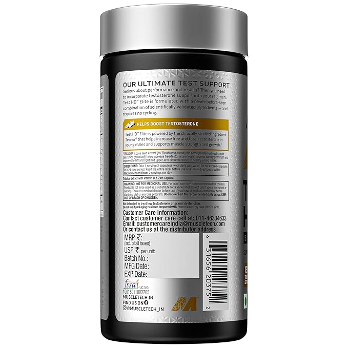 • Test HDTM Elite is powered by the clinically studied ingredient Tesnor that helps increase free and total testosterone in young males and supports muscle strength and growth.
