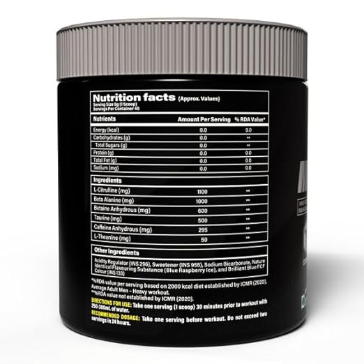 L-Citrulline,Tart Cherry Extract (Prunus Cerasus),Schisandra Chinensis (Berry) Extract,Cnidium Monnieri Extract,Yohimbe Bark Extract,Caffeine Anhydrous,Rhodiola Rosea,Ursolic Acid,Terminalia Arjuna Extract,Prickly Pear Extract (Opuntia Fucis-Indica) (Fruit),Alpha-GPC,Raspberry Extract,Tamarind Extract (Tamarindus Indica),Natural & Artificial Flavours,Malic Acid,Sucralose