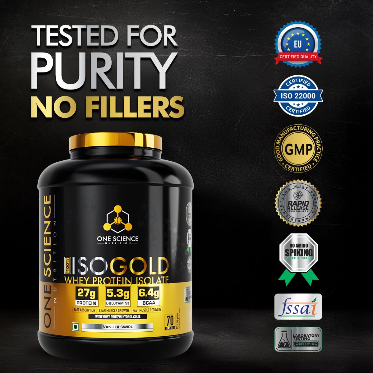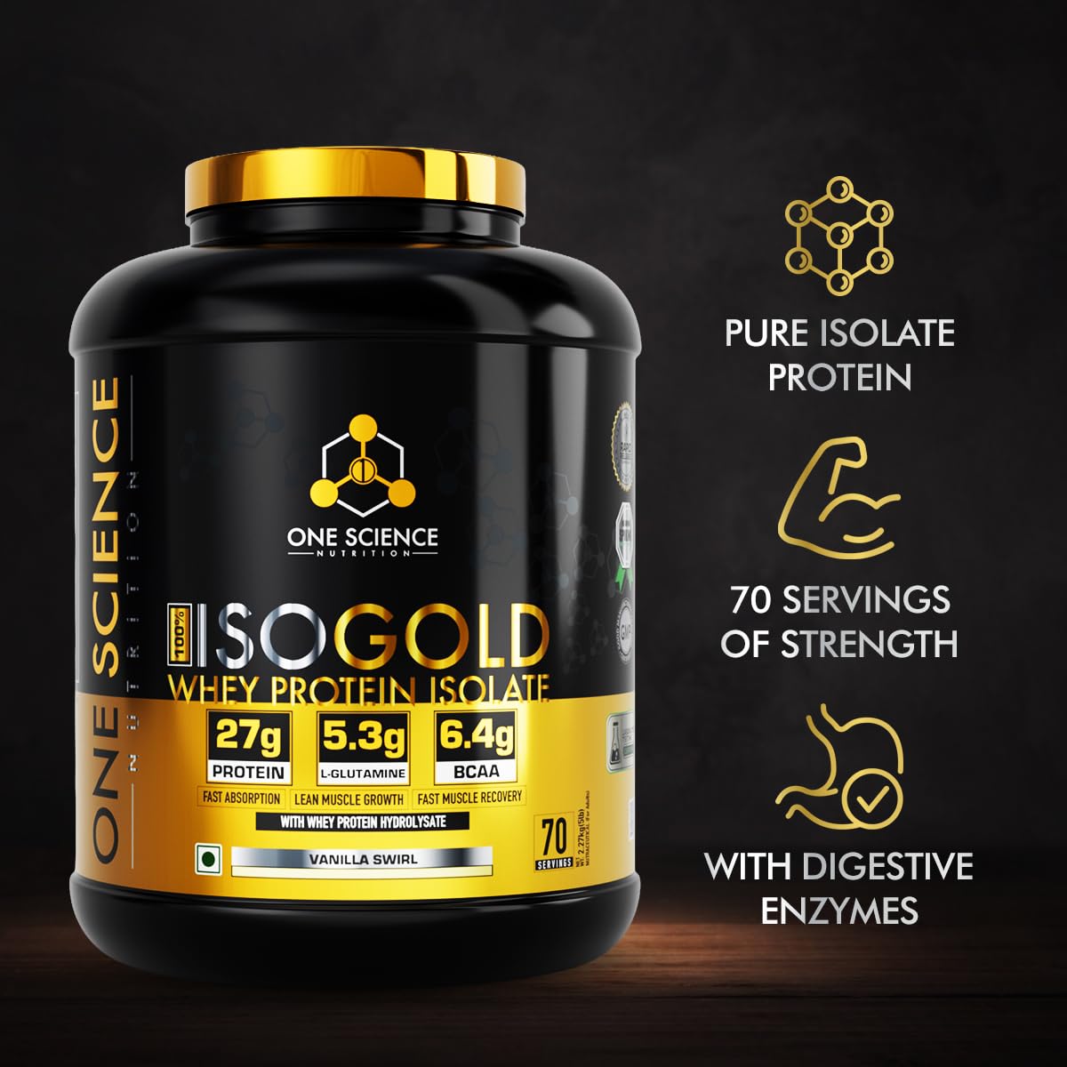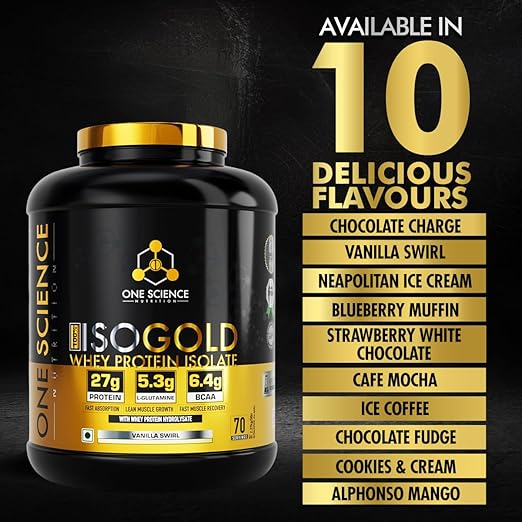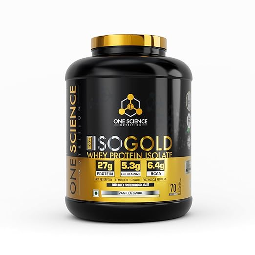 Experience the power of ultra-pure protein with One Science Nutrition ISO Gold Whey Protein Isolate, crafted for athletes, fitness enthusiasts, and anyone looking to build lean muscle with clean and fast-absorbing nutrition. Each serving delivers 27g of high-quality whey protein isolate, enhanced with whey hydrolysate for superior absorption and quick muscle recovery.Formulated with 5.3g L-Glutamine and 6.4g BCAAs, this advanced protein supplement supports lean muscle growth, boosts post-workout recovery, and helps reduce muscle fatigue after intense training sessions. Whether your goal is muscle building, fat loss, or maintaining an active lifestyle, ISO Gold is designed to fuel your body with pure performance nutrition.The delicious Chocolate Charge flavour provides a smooth, dessert-like taste without added sugar, fillers, or unwanted carbs—making every scoop enjoyable and guilt-free. With 70 servings per jar, you get premium quality, excellent value, and results you can trust.