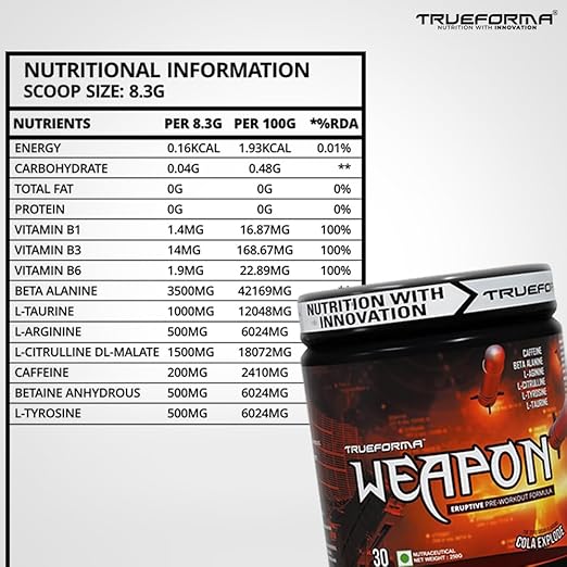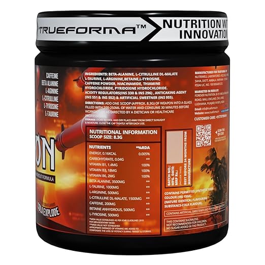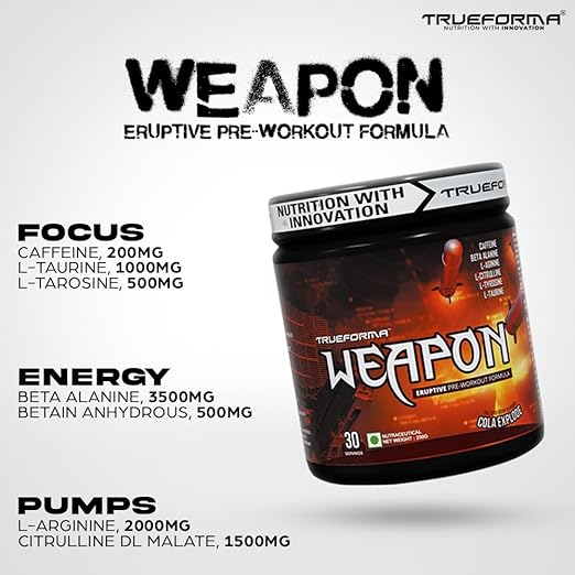 Trueforma Weapon is not just a pre-workout; it’s a performance-enhancing formula designed to fuel your most intense training sessions. This cutting-edge blend delivers a potent combination of scientifically-backed ingredients to ignite explosive energy, razor-sharp focus, and mind-blowing pumps, helping you push your limits and achieve your fitness goals.